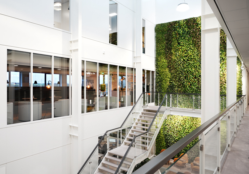 Duurzaamheid is bij Euroma geen keuze, maar een fundament. Het volledige interieurontwerp is getoetst aan de strenge BREEAM-standaarden. Dit vertaalt zich in een gezonde en vitale werkomgeving. We hebben de werkplekken strategisch rondom de gevels gepositioneerd, zodat elke medewerker profiteert van maximaal daglicht. Een imposante groenwand in het hart van het kantoor fungeert als natuurlijke luchtzuiveraar en brengt de natuur letterlijk naar binnen.