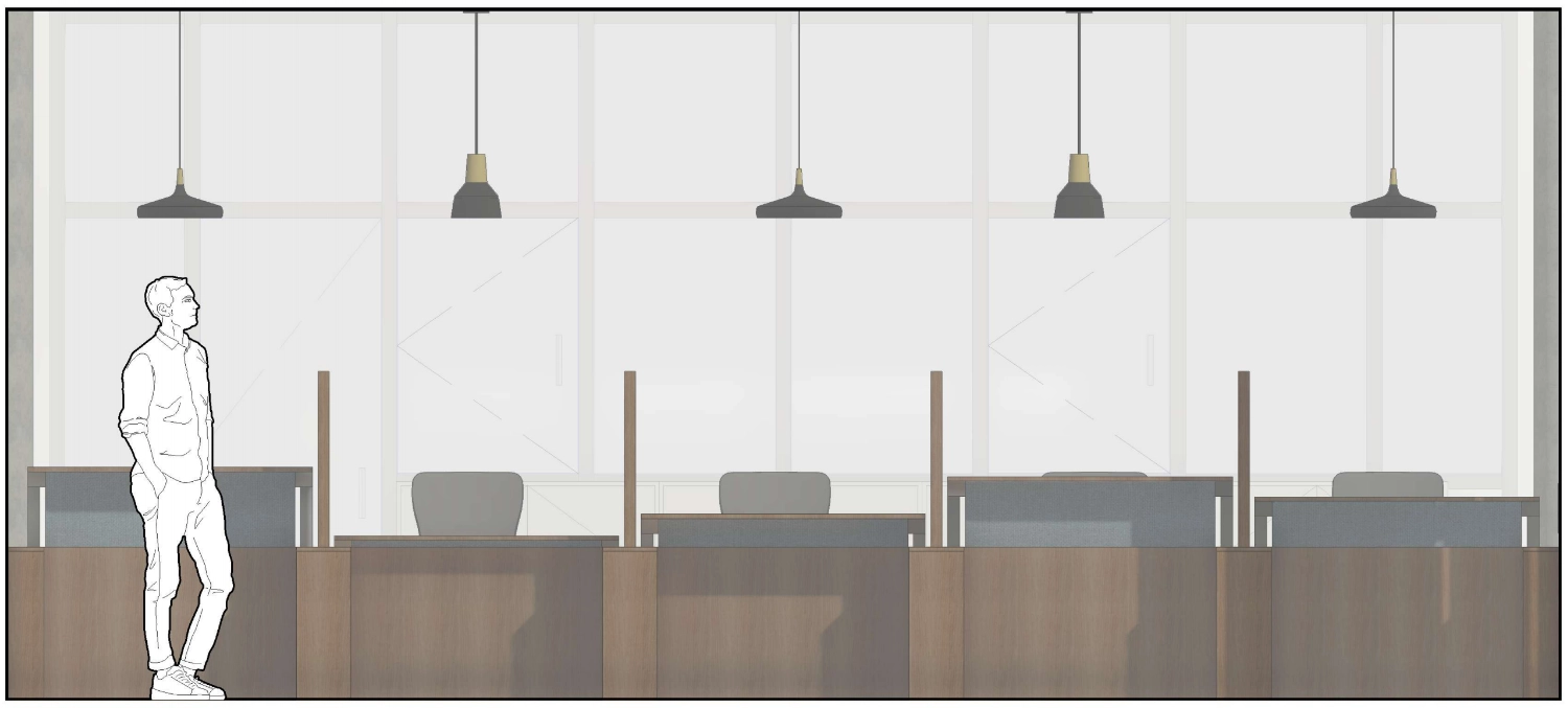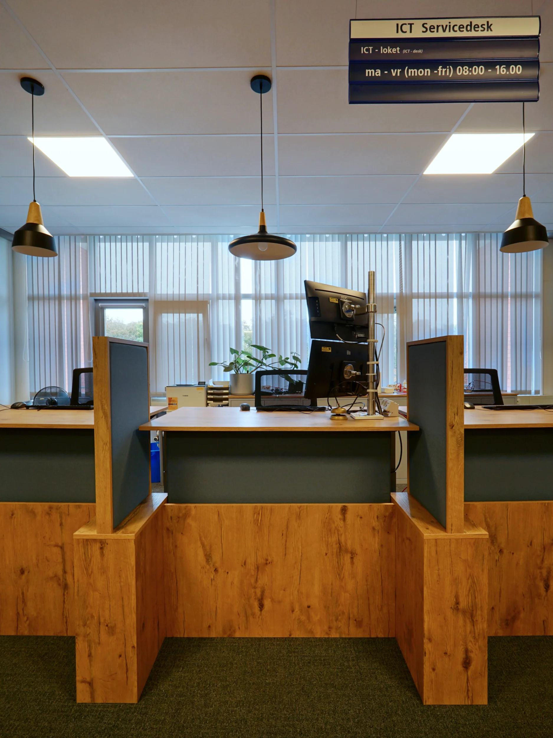 In ons interieurontwerp staat de gebruiker centraal. De nieuwe balie biedt drie volwaardige, in hoogte verstelbare werkplekken. Een cruciaal onderdeel van de visie is het verlaagde werkblad: hierdoor kunnen ook mindervaliden op een gelijkwaardige manier geholpen worden, zonder dat zij naar een apart loket hoeven uit te wijken. Door te kiezen voor één vlak werkblad – zonder verhoogde opzet voor bezoekers – ontstaat er een open en eerlijke interactie tussen medewerker en student.
