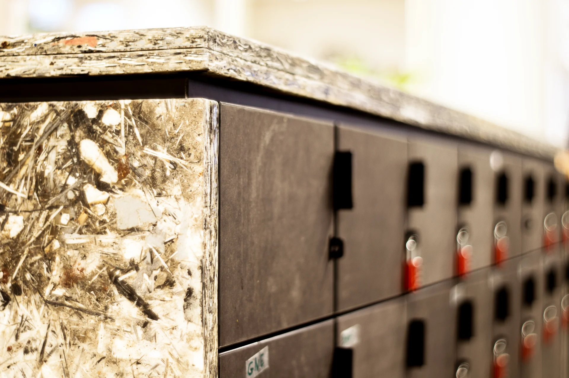 Een van de meest grensverleggende aspecten van dit project was de ontwikkeling van een nieuw plaatmateriaal voor het maatwerkmeubilair, zoals kluisjes, tafels en pantry’s. Dit innovatieve materiaal bestaat voor maar liefst 95% uit hergebruikt composiet, afkomstig van bronnen zoals oude plezierboten. Dit laat zien hoe we afval transformeren tot hoogwaardige grondstof, met een aanzienlijke milieuwinst als resultaat.